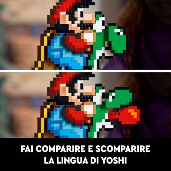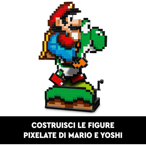 Crea tanta nostalgia per i fantastici visual della prima generazione dei giochi Super Mario™ con questo modello da esposizione Super Mario World™: Mario e Yoshi. Un divertente regalo LEGO® Super Mario™ per adulti, questo set Nintendo® da collezione presenta i personaggi pixelati di Mario e Yoshi ed è una divertente decorazione per la casa o l’ufficio di ogni fan. Gira la maniglia per far correre Yoshi con Mario sulla schiena e ruota la manopola per azionare la lingua di Yoshi.