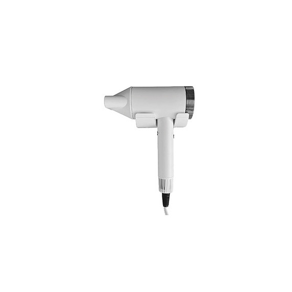 Asciugacapelli in ABS bianco opaco. Motore brushless. Assorbimento totale max 1500 W. Voltaggio: 220-240 V - Frequenza: 50-60 Hz. At tivazione con pulsante a rilascio. 2 regolazioni di velocità e 3 di temperatura. Filtro rimovibile. Termostato di sicurezza sulla resistenza. Concentratore d’aria ad aggancio magnetico. generatore di ioni. isolamento elettrico: Classe II.