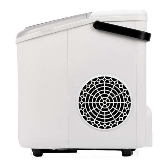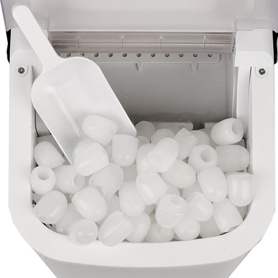 Macchina per il ghiaccio ideale sia in ambito domestico che per piccole attività commerciali. Possibilità di impostare 2 misure dei cubetti: piccoli e grandi. Capacità di produzione: 8-10Kg in 24 ore (circa 1100 cubetti). Capacità contenitore acqua: 1.1L. Capacità contenitore ghiaccio: circa 500g. Spegnimento automatico con contenitore acqua vuoto o ghiaccio pieno. Funzionamento automatico e silenzioso. Compressore di ultima generazione che utilizza gas ecologico. Gas ecologico R600a, 26g. Accessori: vaschetta per ghiaccio, paletta. Potenza: 112W. Alimentazione: AC 220-240V ~ 50-60Hz, 0.85A. Dimensioni: 23 x 30 x 27 cm.