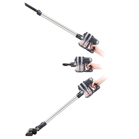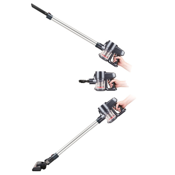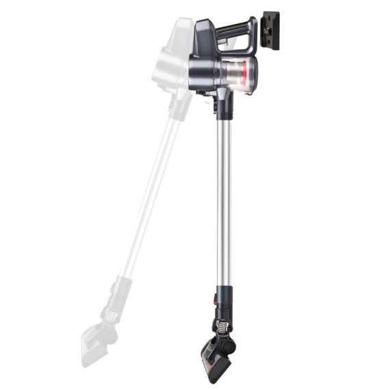 Aspirapolvere senza fili ricaricabile leggero e maneggevole come una scopa elettrica, da usare dal pavimento al soffitto. 2 livelli di potenza. Dotato di sistema ciclonico e doppio filtro HEPA + metallo e di una forza aspirante 9.5 kPa con due livelli di potenza. Contenitore da 700 ml dotato di svuotamento rapido ed igienico senza contatto con lo sporco, per renderne più semplice la pulizia. Potenza 120W.Forza aspirante 9.5 kPa. Potente Batteria Ioni di Litio 22.2V, 2500mAh. Autonomia fino a 40 minuti no stop (ricarica in 4 ore). Funzionamento silenzioso, 76dBa. Accessori inclusi: Spazzola motorizzata (per pavimenti e tappeti), spazzola multifunzione (per pulire a fondo tessuti, divani, automobile, letto ecc), beccuccio per aspirazione angoli, il tubo rigido in alluminio e la base per montaggio a muro. Alimentatore. Dimensioni: 107 x 21 x 11,5cm. Adattatore: IN: AC 100-240V ~ 50-60 Hz - OUT: 27V – 500mA