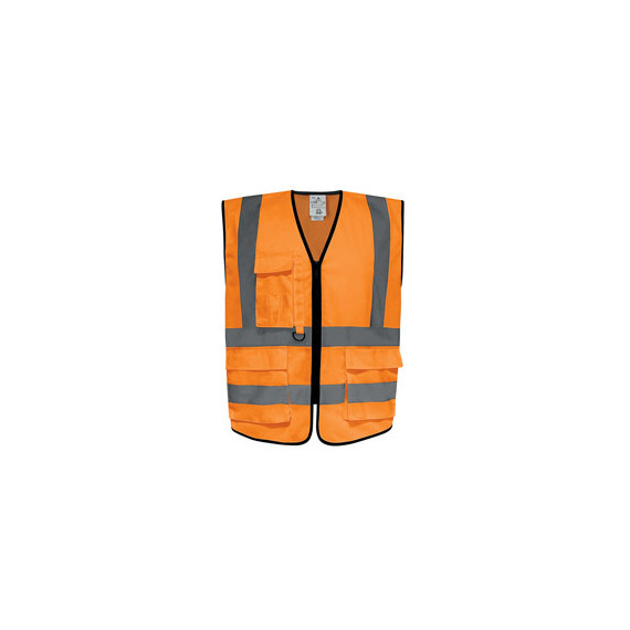 Gilet alta visibilità multitasche in tessuto a rete in 100% poliestere riciclato per il massimo trasferimento dell'umidità. 2 tasche con patta a soffietto, 1 tasca per il telefono, 1 tasca portapenne. EN ISO 20471 CE, CLASSE 2 X25 ANSI ISEA 107:2020, TYPE R - CLASSE 2, EN ISO 13688.