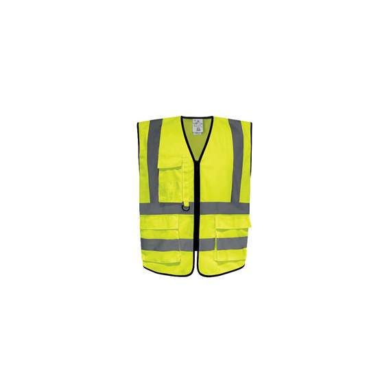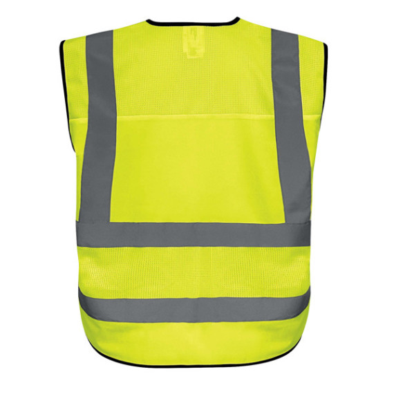 Gilet alta visibilità multitasche in tessuto a rete in 100% poliestere riciclato per il massimo trasferimento dell'umidità. 2 tasche con patta a soffietto, 1 tasca per il telefono, 1 tasca portapenne. EN ISO 20471 CE, CLASSE 2 X25 ANSI ISEA 107:2020, TYPE R - CLASSE 2, EN ISO 13688