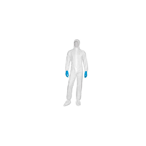 Tuta con cappuccio elasticizzata non tessuto (70% polipropilene / 30% polietilene). Chiusura con zip sotto baverina. Elastico di chiusura in testa, vita, ai polsi ed alle caviglie.