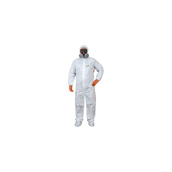 Tuta con cappuccio elasticizzata non tessuto (70% polipropilene 30% polietilene). Parte posteriore 100% polipropilene SMS molto traspirante. Chiusura zip sotto baverina. Elastico di chiusura in testa, in vita, ai polsi ed alle caviglie. 70% polipropilene 30% polietilene - non tessuto bianco. Il polietilene assicura una migliore resistenza alle aggressioni chimiche oltre che una migliore resistenza meccanica (abrasione - lacerazione). 100% polipropilene SMS - non tessuto arancione. Il processo SMS fornisce una migliore traspirazione del prodotto. Rinforzo tra le gambe per una maggiore resistenza agli strappi. Categoria DPI: 3. Certificazione CE. Conformità alle norme EN ISO 13688:2013, EN ISO 13982-1:2004+A1:2010, EN13034:2005+A1:2009, EN1073-2:2002 e EN1149-5:2018.