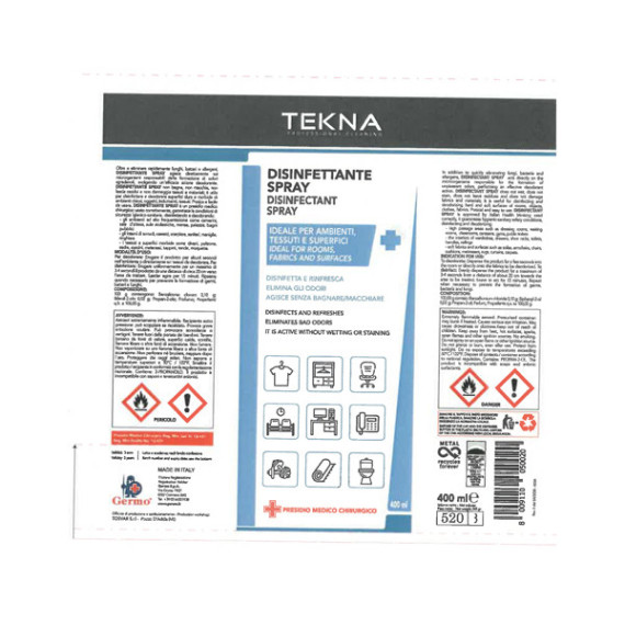 Disinfettante spray 400ml per ambienti, tessuti e superfici. Presidio medico chirurgico, attivo con il Coronavirus e dermatologicamente testato. Utile per disinfettare e deodorare rapidamente: elimina germi, batteri, funghi ed allergeni. Efficace in ambienti ad alta frequentazione. Facile da utilizzare, non bagna, non macchia, non lascia residui e non danneggia tessuti e materiali. Gradevolmente profumato.