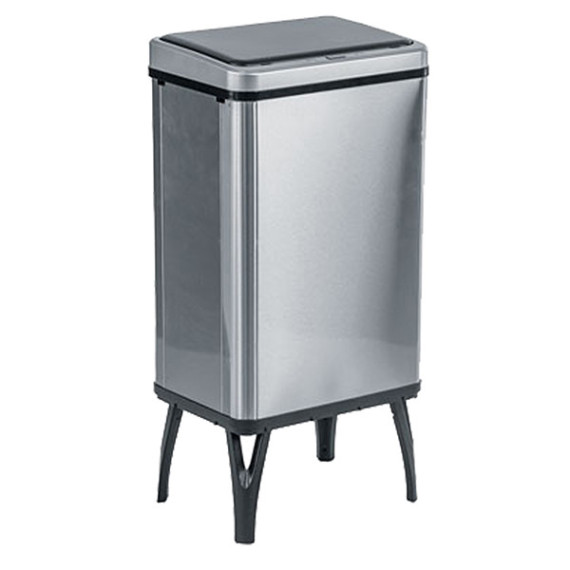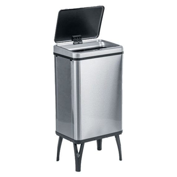 Gettacarte pieghevole per facile assemblaggio e disassemblaggio. Funzionamento a sensore. Corpo in acciaio inox satinato antifingerprint e coperchio in ABS. Anello reggisacco in plastica. Altezza piedini 16.5cm. Funzionamento con 4 pile AA (non incluse). Capacità: 40 litri.