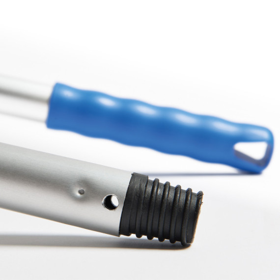 Manico in alluminio 150cm con particolari in polipropilene, con FORO e VITE 23mm. Adatto con FORO per Scope Cotone Penta, Pinza per mop cod. 74096 e Spingiacqua Teseo cod. 86241,Adatto con VITE per Scope, Mop, Levaragnatele. Sistema colore per prevenire la contaminazione batterica tra diversi ambienti.