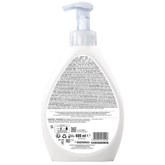 Mousse di sapone profumata per mani e corpo delicata sulla pelle, con ingredienti di origine naturale. 900 erogazioni. Modalità d'uso: applicare il prodotto sulle mani inumidite, frizionare fino ad ottenere una morbida schiuma avendo cura di passare gli spazi tra le dita e i polsi per circa 30 secondi. Risciacquare con acqua. Dermatologicamente testato. pH 5,5. Certificato Ecolabel.