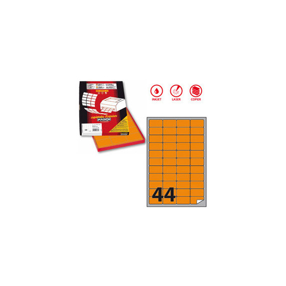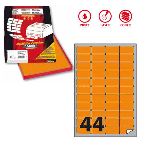 Scatola da 100fg da 21x29,7cm di etichette adesiva permanente arancio fluo. Etichette con angoli tondi. Adatte per stampanti inkjet, laser e copy.