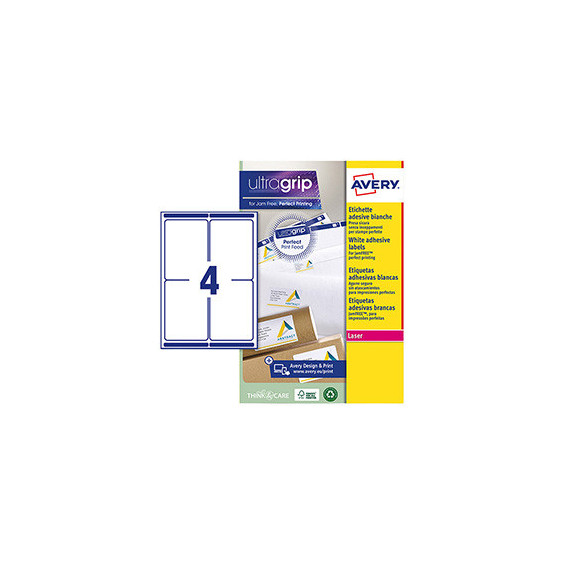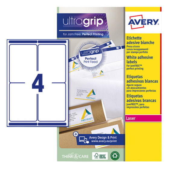 Scatola da 15 fogli in formato A4 di carta bianca adesiva permanente. Ogni foglio contiene 4 etichette rettangolari con angoli tondi nel formato 99,1x139mm. Tecnologia QuickPEEL™. Stampa inkjet, laser e laser colore.