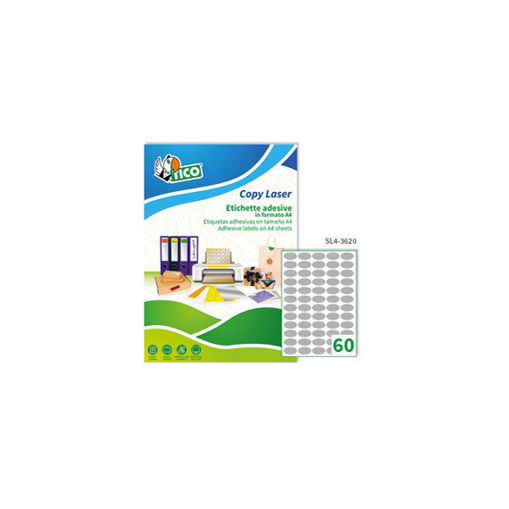 Etichette adesive ovali SL4 - in carta - permanenti - 36 x 20 mm - 60 et/fg - 100 fogli - argento satinato - Tico