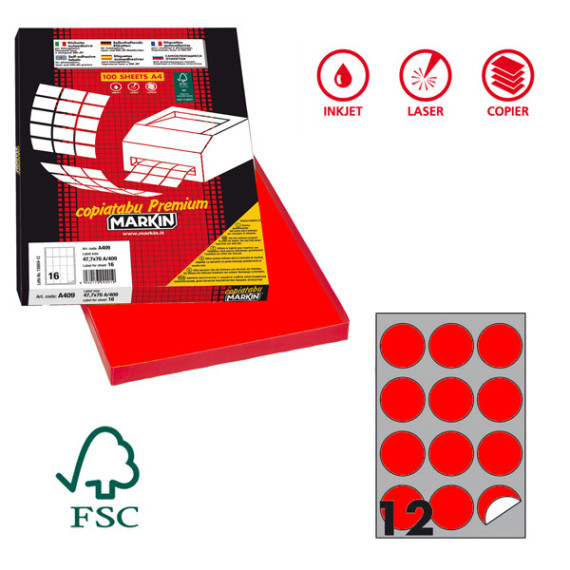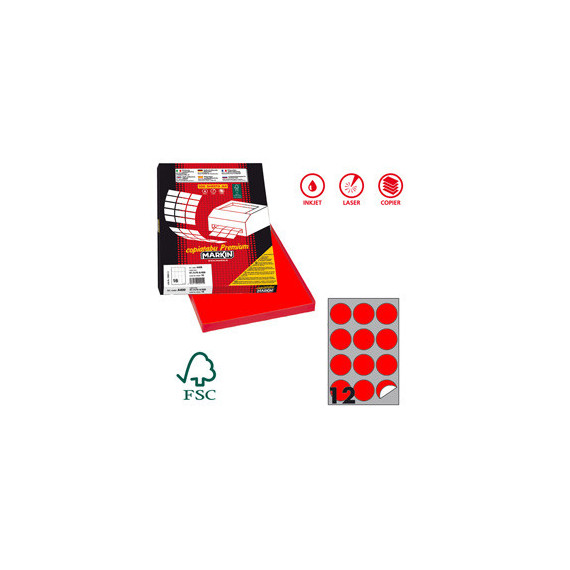 Scatola da 100fogli da 21x29,7cm (A4) di etichette in carta fluo rosso adesive permanenti nel formato. Stampabili con stampanti inkjet, laser e fotocopiatori. 12 etichette tonde per foglio.