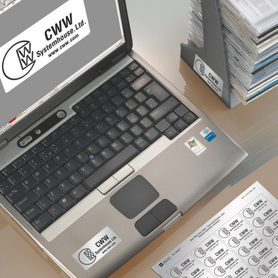 Etichette lucide in poliestere argento. Ideali per identifi care PC ed attrezzature elettroniche in quanto resistono alle temperature da -40°C a +150°C. Perfette per uso esterno, resistono all'acqua, allo sporco, agli strappi e ai raggi UV. Possono essere applicate su metallo, vetro, plastica e legno. Confezione da 20fg A4