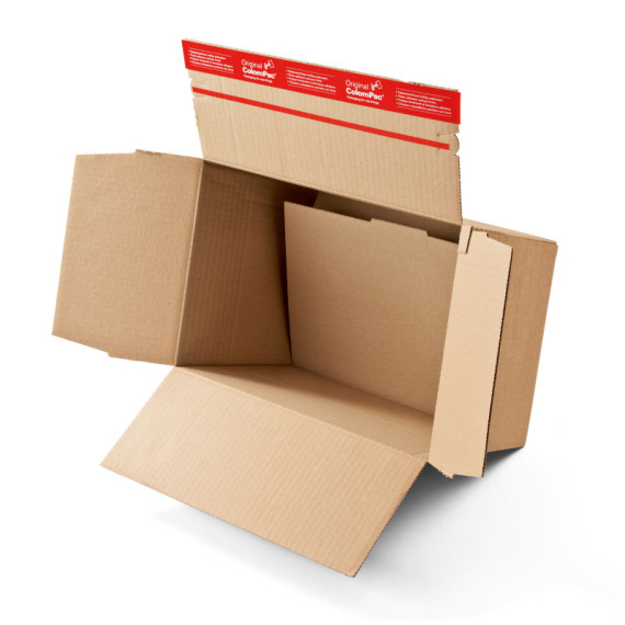 Scatola automontante con coperchio ad alette sovrapposte. Chiusura autoadesiva senza l'utilizzo di nastro adesivo o graffette. Altezza adattabile al contenuto grazie a delle scanalature da 50 a 115mm. Fondo doppio. Formato utile 229x164x50/115mm esterno 238x170x60/130mm.