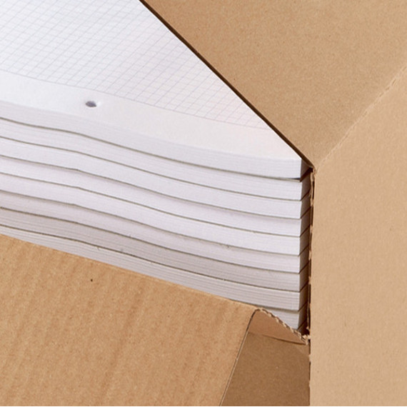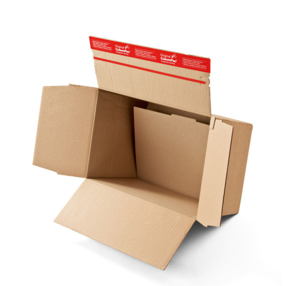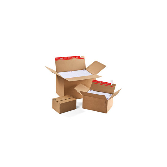 Scatola automontante con coperchio ad alette sovrapposte. Chiusura autoadesiva senza l'utilizzo di nastro adesivo o graffette. Altezza adattabile al contenuto grazie a delle scanalature da 80 a 170mm. Fondo doppio. Formato interne 305x228x70-160mm esterne 310x238x80-170mm