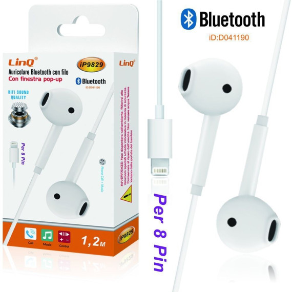 Auricolari Bluetooth LinQ i9829 di alta qualità con filo e innovativa finestra pop-up per una connessione semplice e veloce. Compatibili con dispositivi Apple con connettore 8 Pin.