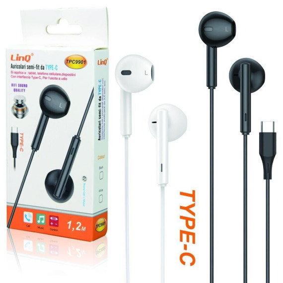 Auricolari type-c con microfono Linq TPC9901 in Ear per smartphone - attacco type-c - tasti volume - bianco o nero - cavo 1,2mt