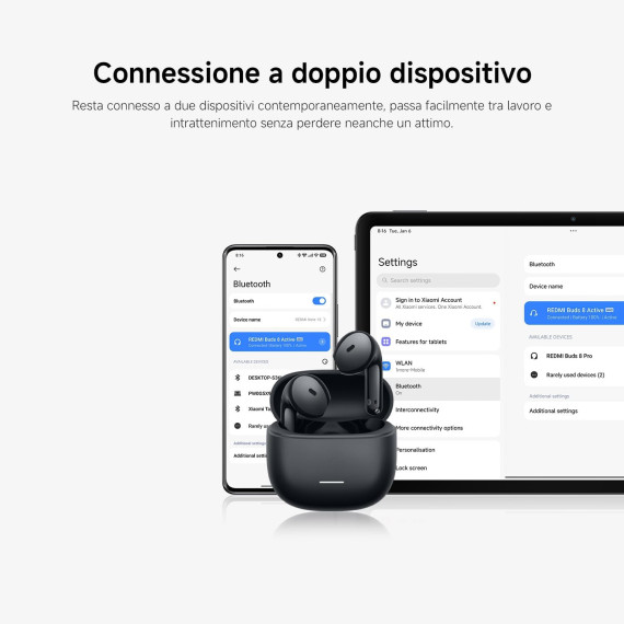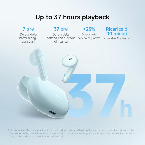 6. Rispetto a REDMI Buds 6 Active in termini di durata della batteria degli auricolari con custodia di ricarica. Dati basati su test effettuati nei laboratori interni Xiaomi. I risultati effettivi possono variare a seconda delle condizioni d'uso, dei livelli di volume e dei fattori ambientali.