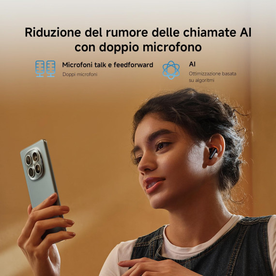 Dotati di due microfoni e arricchiti da algoritmi AI, gli auricolari riescono a sopprimere con precisione i rumori ambientali. Migliora notevolmente la chiarezza delle chiamate per comunicazioni più fluide e un'esperienza di ascolto eccezionale.