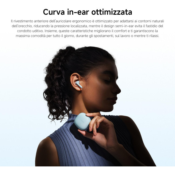 Il rivestimento anteriore dell'auricolare ergonomico è ottimizzato per adattarsi ai contorni naturali dell'orecchio, riducendo la pressione localizzata, mentre il design semi-in-ear evita il fastidio del condotto uditivo. Insieme, queste caratteristiche migliorano il comfort e ti garantiscono la massima comodità per tutto il giorno, durante gli spostamenti, sul lavoro o mentre ti rilassi.