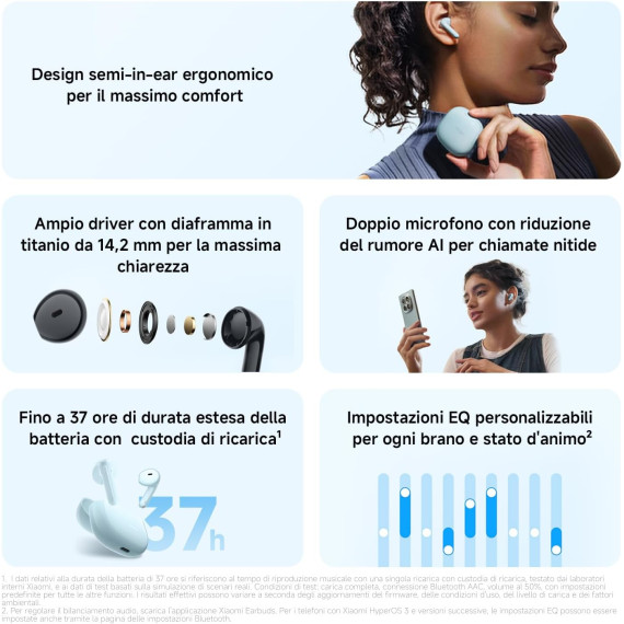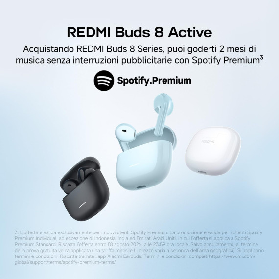 3. L'offerta è valida esclusivamente per i nuovi utenti Spotify Premium. La promozione è valida per i clienti Spotify Premium Individual, ad eccezione di Indonesia, India ed Emirati Arabi Uniti, in cui l'offerta si applica a Spotify Premium Standard. Riscatta l'offerta entro l'8 agosto 2026, alle 23:59 ora locale. Salvo annullamento, al termine della prova gratuita verrà applicata una tariffa mensile (il prezzo varia a seconda dell'area geografica). Si applicano termini e condizioni. Riscatta tramite l'app Xiaomi Earbuds.