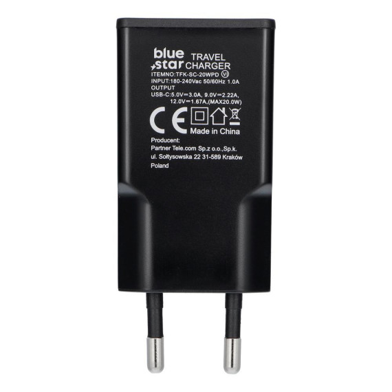 Caricabatterie da muro USB-C 3A Blue Star slim TFK-SC-20WPD nero type-c caricatore QC 4.0 Quick Charge Adaptive Fast Charging